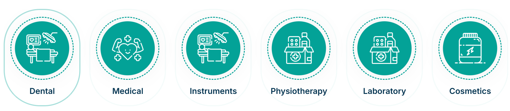 Dental: Dental Materials Dental Equipments Dental Orthopedic Disinfectants Dental Endodontics Dental Instruments Medical Medical Equipments Hospital Furnitures Diagnostics & Monitoring Devices Personal Protective Equipments (PPE) Medical & Surgical Consumables Orthopedic Consumables Instruments Surgical Instruments Physiotherapy Physiotherapy Equipments Physiotherapy Consumable Rehabilitation & Mobility Aids Laboratory Laboratory Consumables Cosmetics